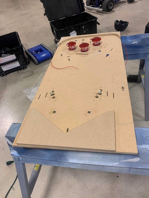 This week I have been focusing on combining all the elements that I have worked on separately together. As show below, I installed most of the game elements like the pop bumpers, the playfield arrow inserts, and the slingshots into the playfield. I also started milling out the borders that keep the ball in play.