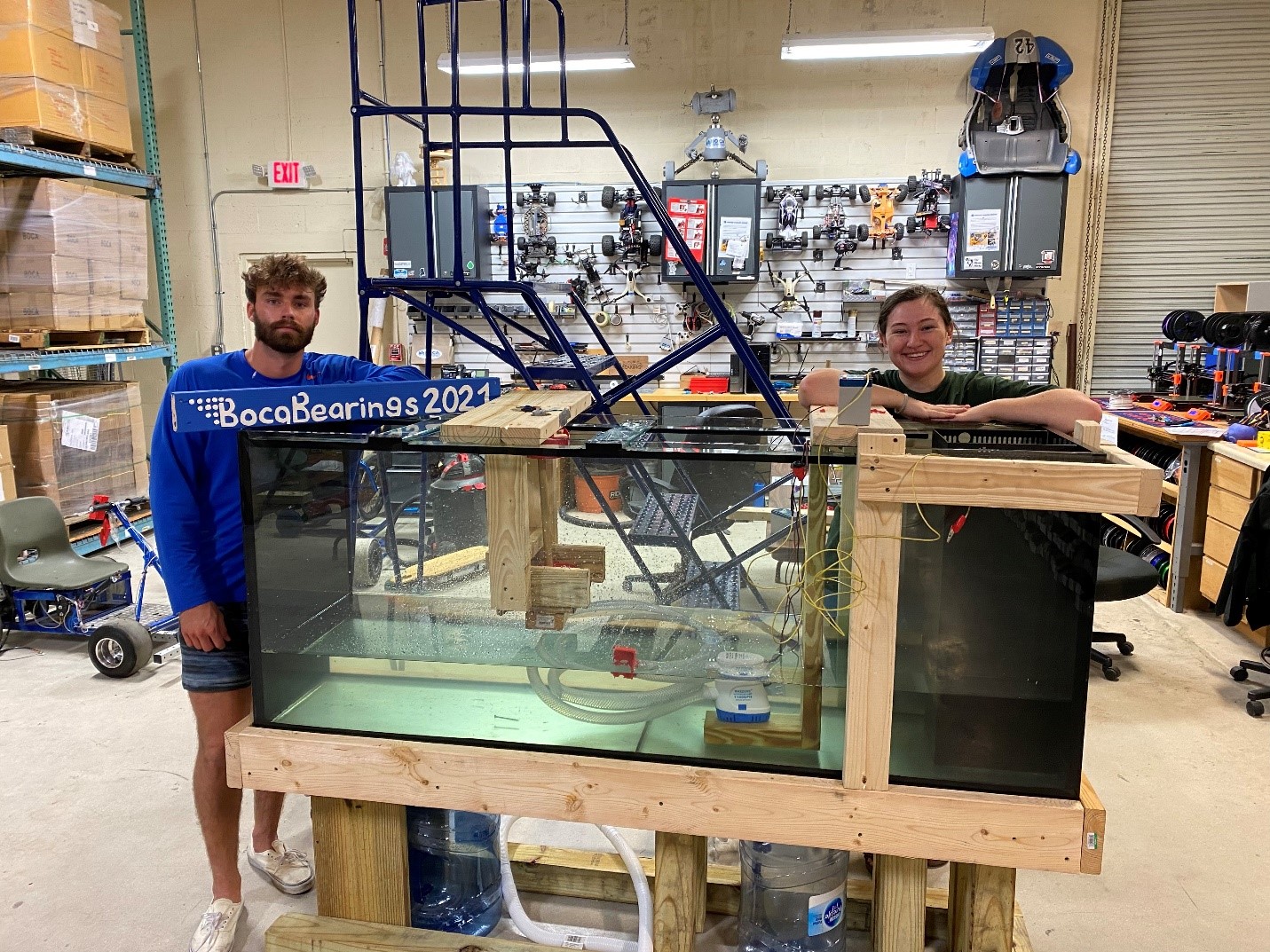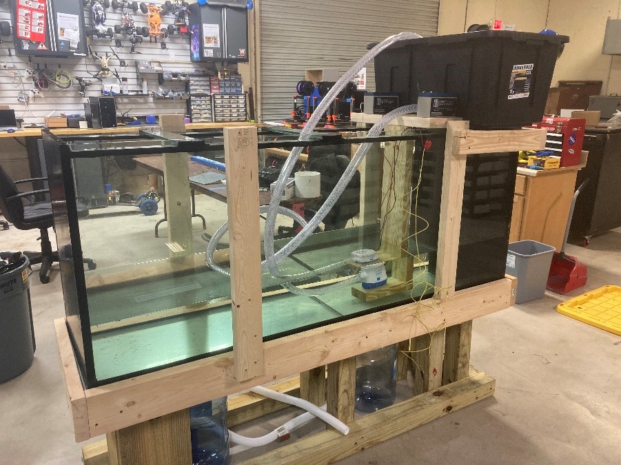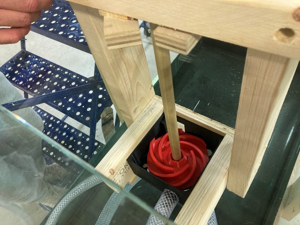 In remedy of this issue, Carmen and Tyler decided to have one bilge pump situated at the bottom of the tank, and the tube leading directly over the turbine. In this, the design idea was to have the water fall back into the tank and then be recirculated by the bilge pump, creating a loop.