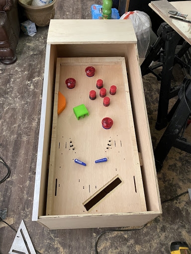 The next step for this machine will be to finish cutting the holes for the buttons and then stain the box black and the playfield a dark brown using some Stain I have from a previous project, once that is done handles will be added for easier transit, and then finally the wiring will be finished.