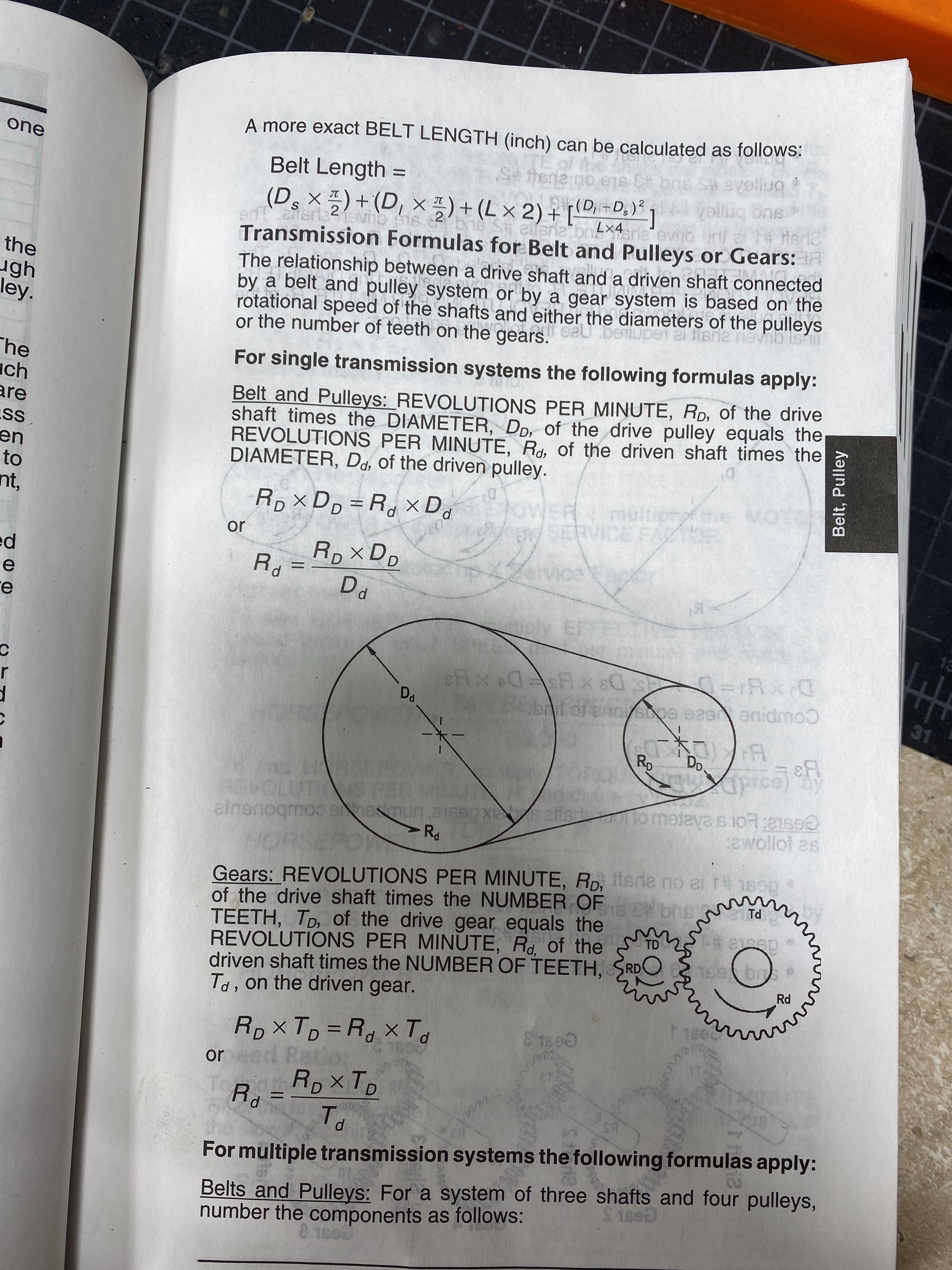 L = 7.125 % axle to axle distance Dl=3; %dimension of the pulley on the transmission Ds= 5;% Diameter of the pulley on the jack shaft BL= (Ds*(pi/2))+(Dl*(pi/2))+(L*2)+[((Dl-Ds).^2)./(L*4))] %Belt length This was based off the equation found in the book Desk Ref by Thomas J. Glover as shown in the image below.