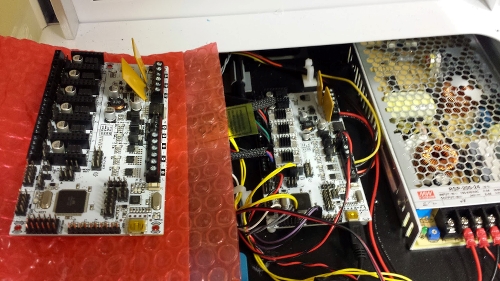 The first thing I dealt with was the RUMBA board. Our printer is under warranty, so they sent us a new board, and it was a relatively easy switch. There are quite a few connections to the RUMBA, so I took a picture before removing the old one.