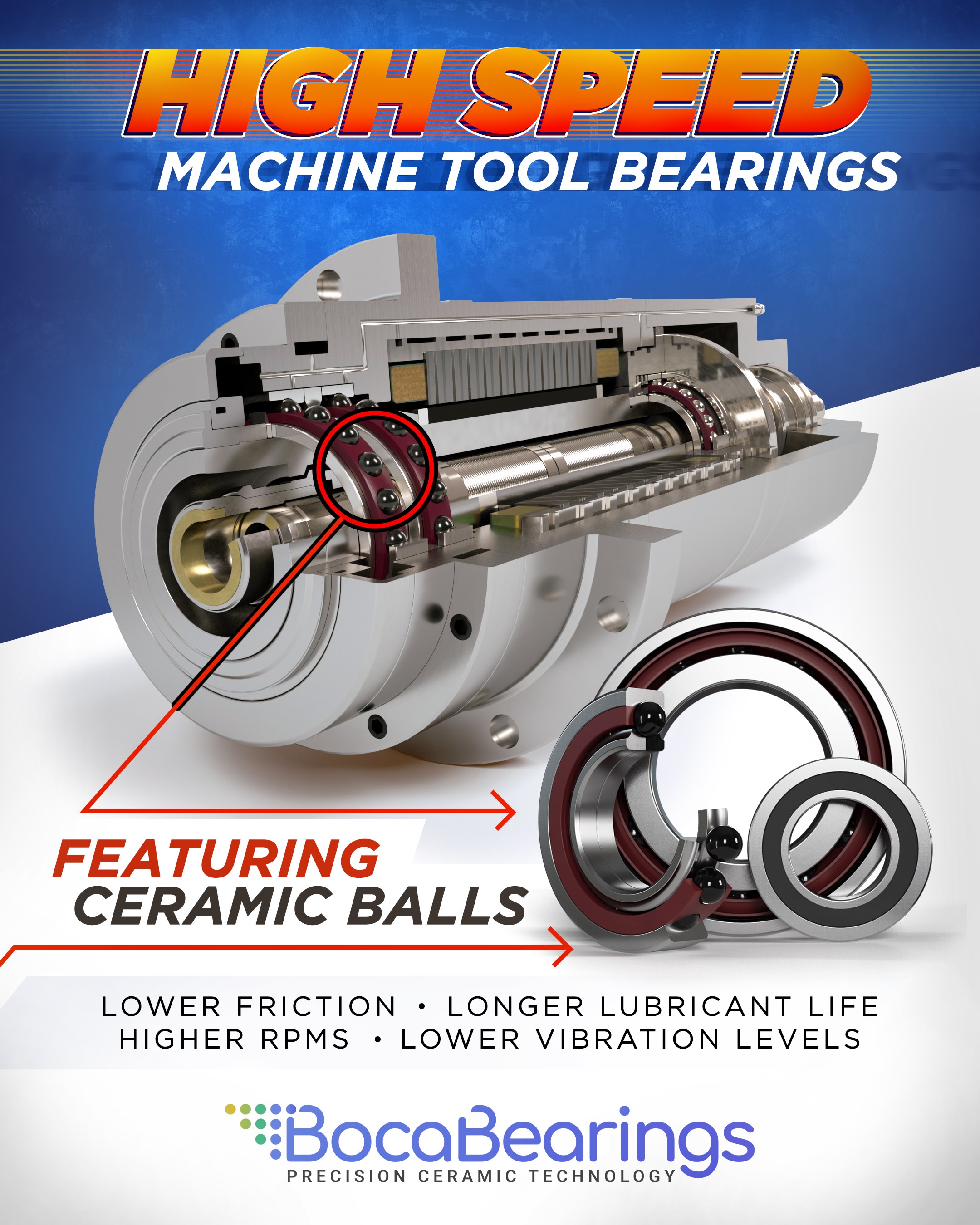 The Boca Bearing Company's new line of steel and ceramic hybrid machine tool spindle bearings are designed for today's demanding manufacturing applications. A machine tool is a machine for shaping metal or other materials, usually by cutting, boring, grinding, or shearing. The latest bearing design delivers higher spindle speeds, increased stiffness and greater resistance to high temperatures. This allows the spindle to machine more material in less time while maintaining tolerances. Extra hard ceramic balls are available with steel races to make for an exceptionally accurate and long lasting machine tool bearing.